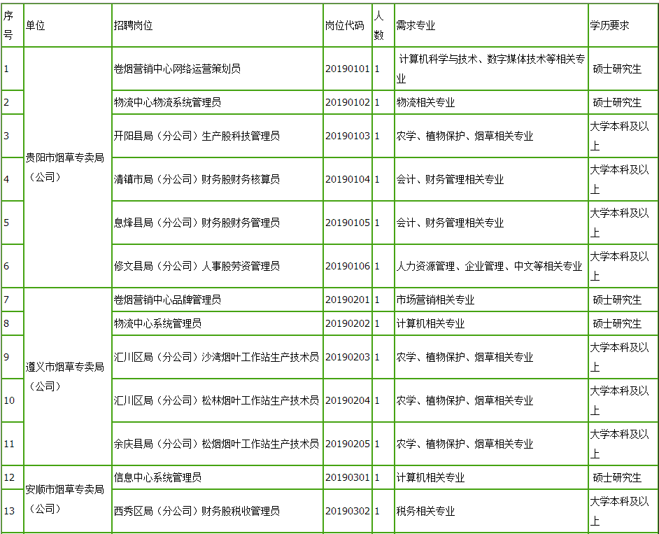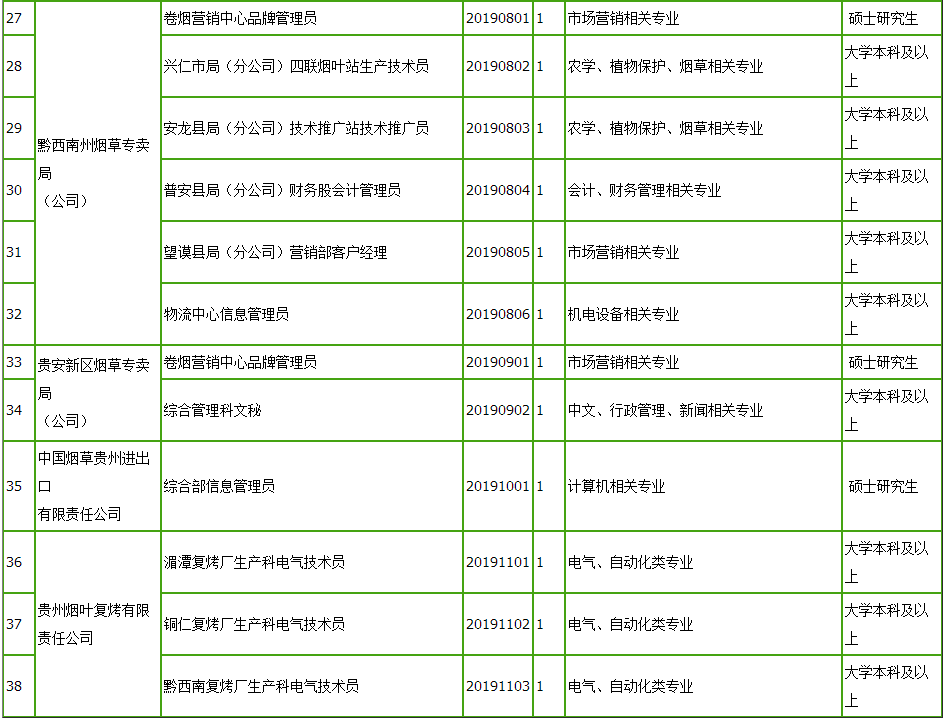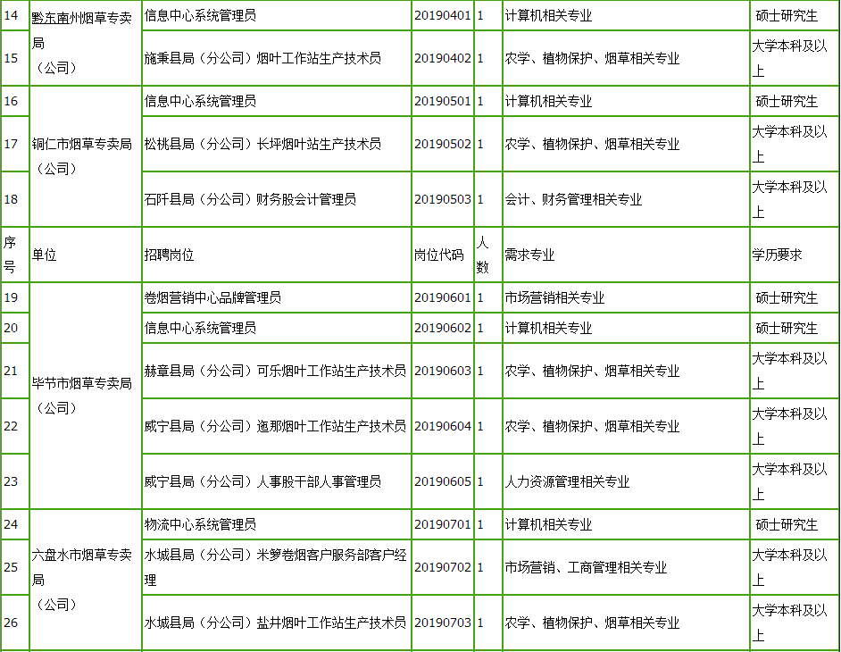 附件:2019年贵州省烟草专卖局(公司)招聘岗位表