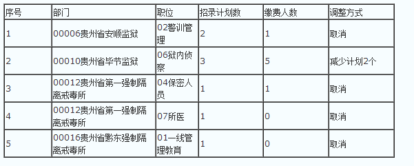 取消或减少的职位见《贵州省2019年省直及垂管系统公开招录公务员职位招录计划取消和减少情况表》(附件1),《贵州省2019年省直及垂管系统公开招录人民警察职位招录计划取消和减少情况表》(附件2)。