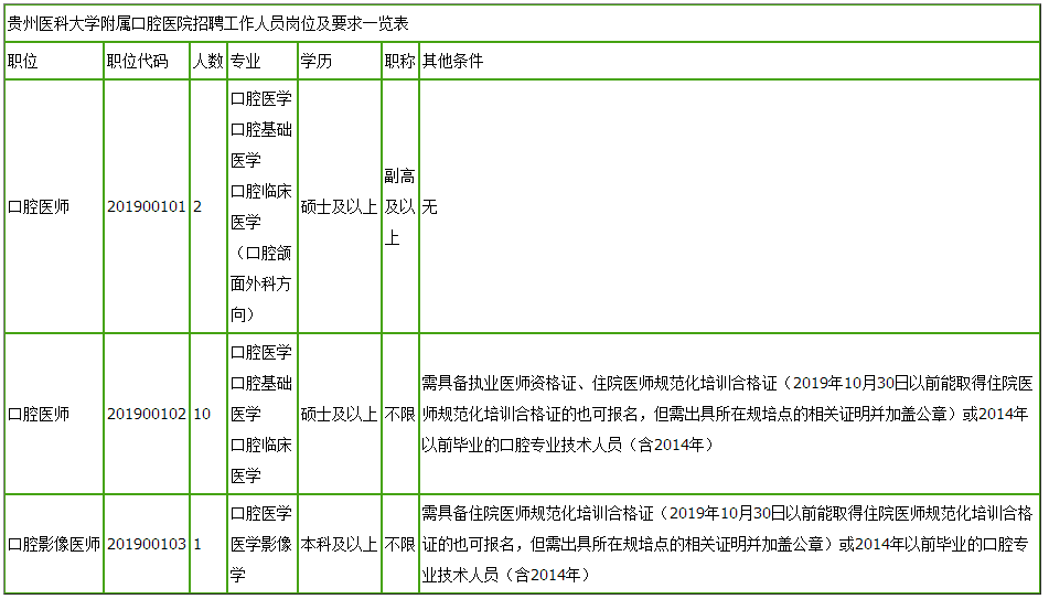 1.贵州医科大学附属口腔医院2019年公开招聘工作人员岗位及要求一览表
