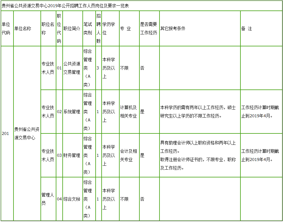 具体招聘岗位及要求见《贵州省公共资源交易中心2019年公开招聘工作人员岗位及要求一览表》(附件1)。
