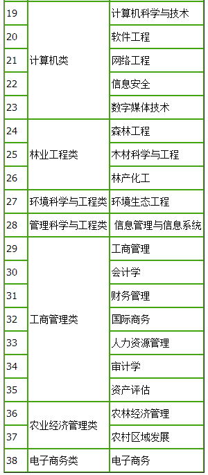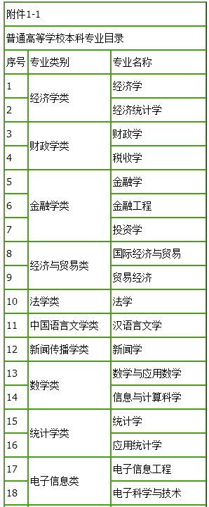本科(专业类别):经济学类、财政学类、金融学类、经济与贸易类、管理科学与工程类、数学类、统计学类、中国语言文学类、法学类、电子信息类、计算机类、林业工程类、电子商务类、环境科学与工程类、新闻传播学类、工商管理类、农业经济管理类
