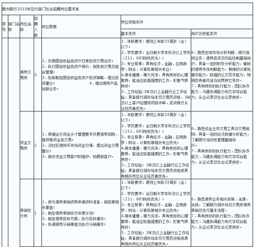 详见《贵州银行2019年总行部门社会招聘岗位需求表》。