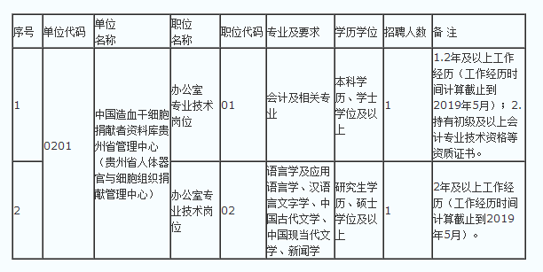具体招聘岗位及要求见《中国造血干细胞捐献者资料库贵州省管理中心(贵州省人体器官与细胞组织捐献管理中心)2019年公开招聘工作人员职位及要求一览表》(附件1)。