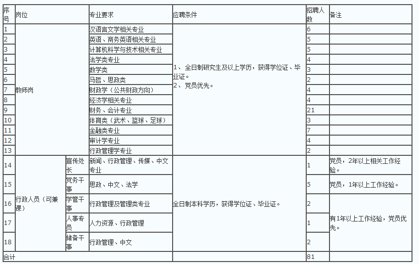 一、招聘岗位及人数:根据工作需要,我校拟面向社会公开招聘教学及行政人员共计81名。详见《贵州财经大学商务学院招聘岗位汇总表》(附件1)。