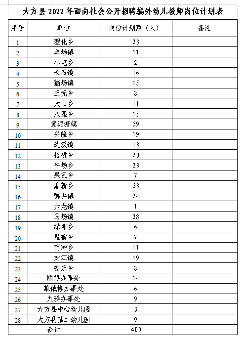 招聘职位详见《大方县2022年面向社会公开招聘编外幼儿教师岗位计划表》(附件1,以下简称《岗位表》)。
