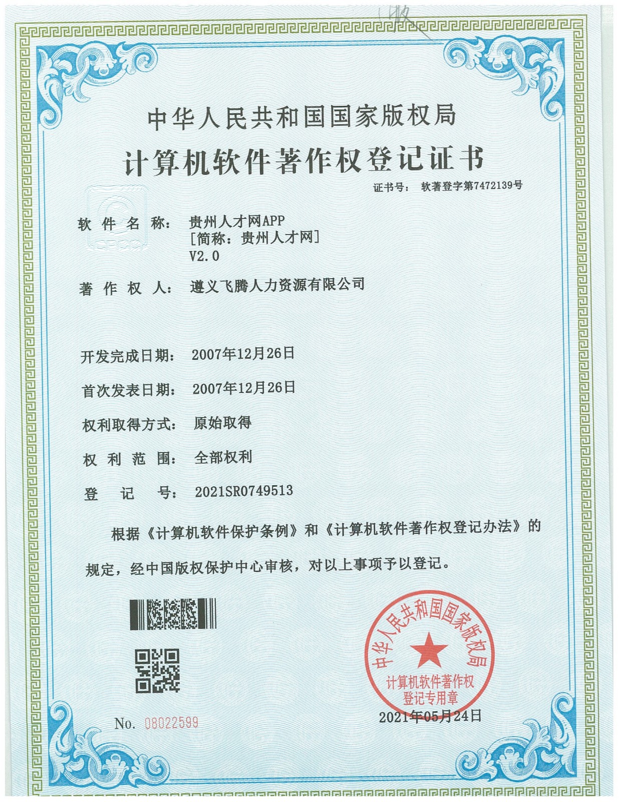 贵州人才网获国家版权局著作权登记证书